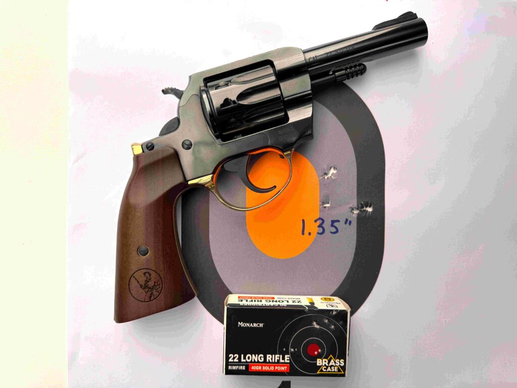 The tightest group at 1.35” was produced using the Monarch loads with 40 gr. solid-point bullets at standard velocity