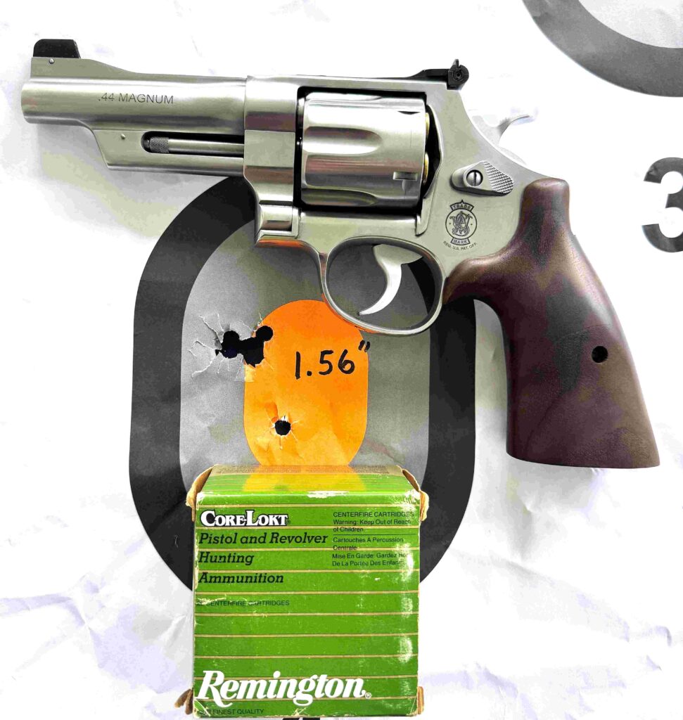A flyer opened this one-hole group to 1.56,” it was still the smallest 5-shot group and was made with the hard-kicking Remington .44 Magnum 275 gr. Core-Lokt JHP.