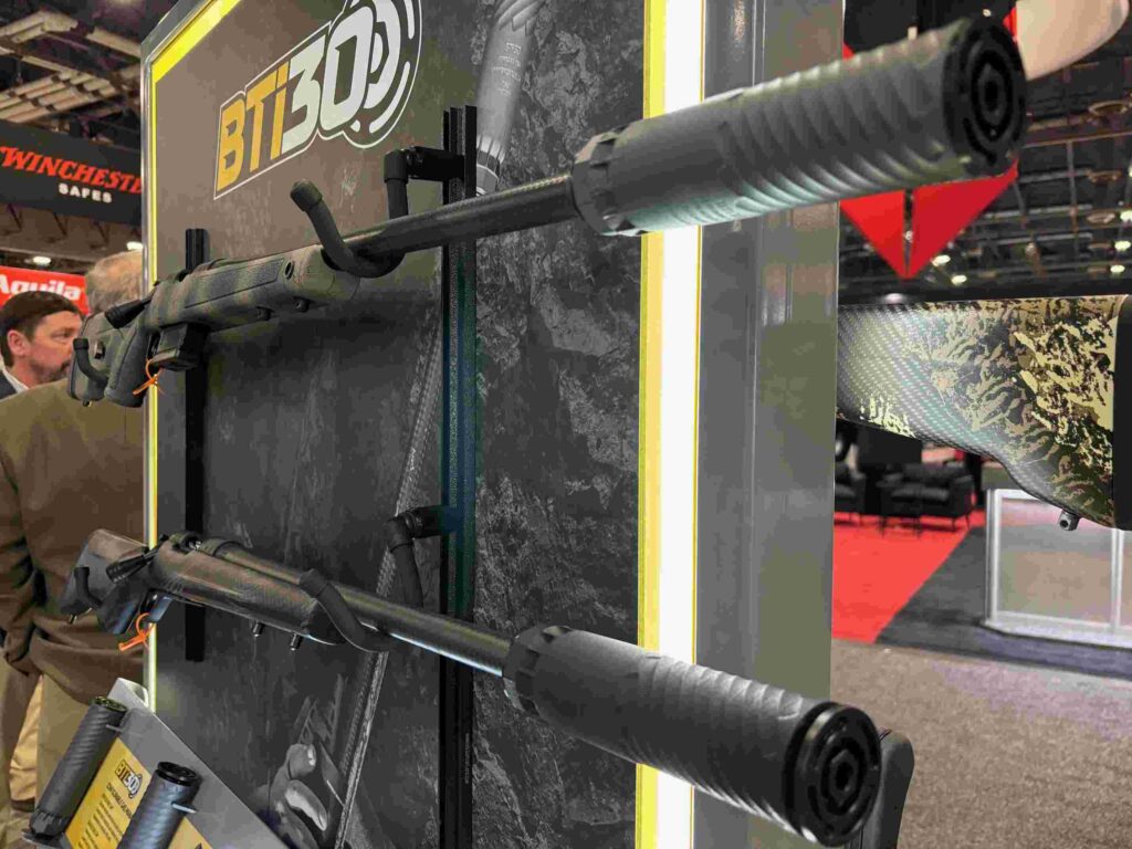Bergara, well-known maker of hunting rifles, showed off their up-and-coming self-branded suppressor that will ship in Q2. The BTi30 made of titanium and is a tidy package at 6.25 inches long and weighing 9.7 ounces. Closed and open end caps ship with each. The BTi30 can attach to any hub mount. Outside, the raised spiral pattern on this 3D-printed suppressor makes for faster cooling and contributes to its relatively light weight. Color choices are gray, tan, or black. Bergara reps are avid big game hunters and were eager to share their satisfaction with the company’s well-tested can as well as suppressor-equipped hunting in general. SRP $1,099