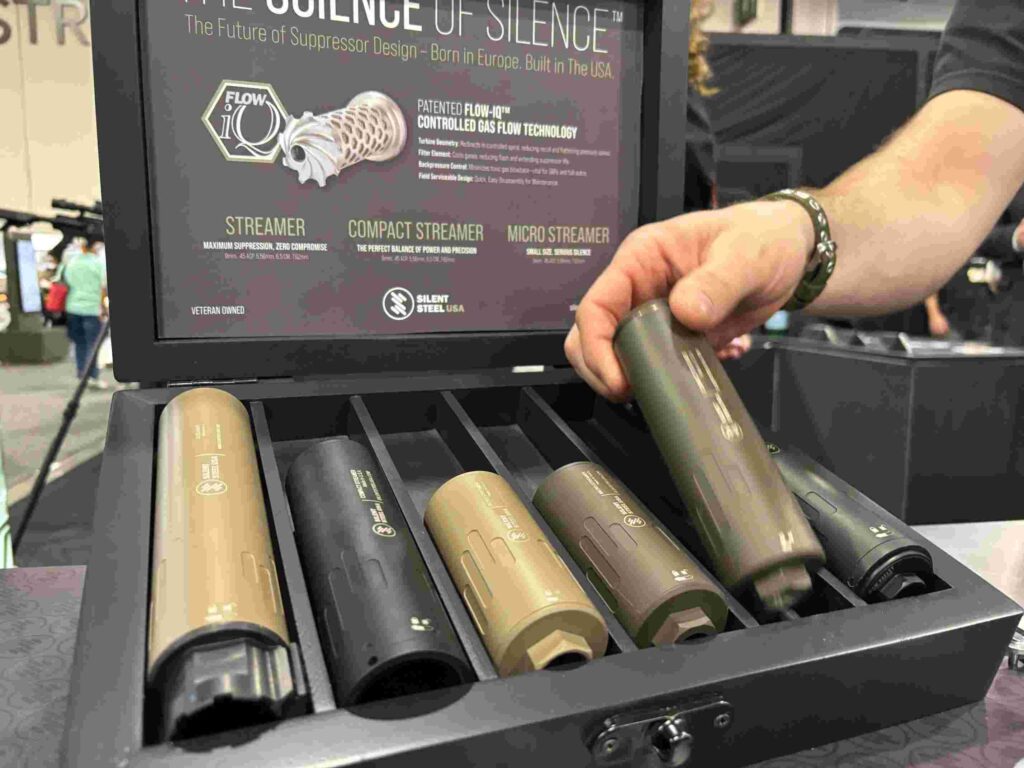 Silent Steel USA (not to be confused with their European counterpart) has a factory and office base in Michigan. They’re currently focused on serving military/law enforcement markets. Streamer is the name of their latest series, with three sizes all optimized for semi- and full-auto rifles. “Where we shine is serviceability,” said the booth rep, explaining that the Streamer’s European-inspired construction allows for disassembly of the outer sleeve and cleaning the device while it’s still mounted. Durability is a close second, he said, with round counts of 50,000 on a single suppressor having occurred during testing with no adverse effects on function. Silent Steel is the only producer this writer encountered that discussed operator health outside of hearing preservation. Blowback dissipation from the Streamer cans, they say, allows the shooter to avoid inhaling carcinogenic fumes, a real concern in high-round count training. The Streamer’s primary, compact, and micro models can be mounted by direct thread or quick detach systems. Available colors are black, brown, and green. SRP ranges from $999 for the Micro Streamer to $1,499 for the standard model.