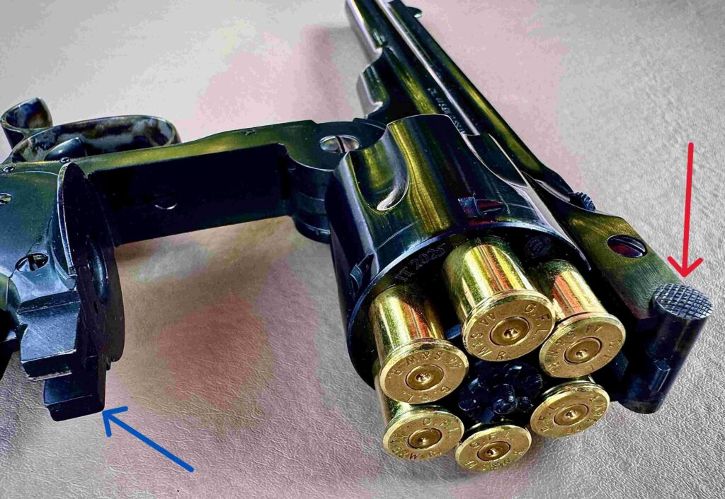 Lifting the top-latch (red arrow) allows the revolver to be broken open and the barrel lowered to reload; the latch secures to the two frame studs (blue arrow).