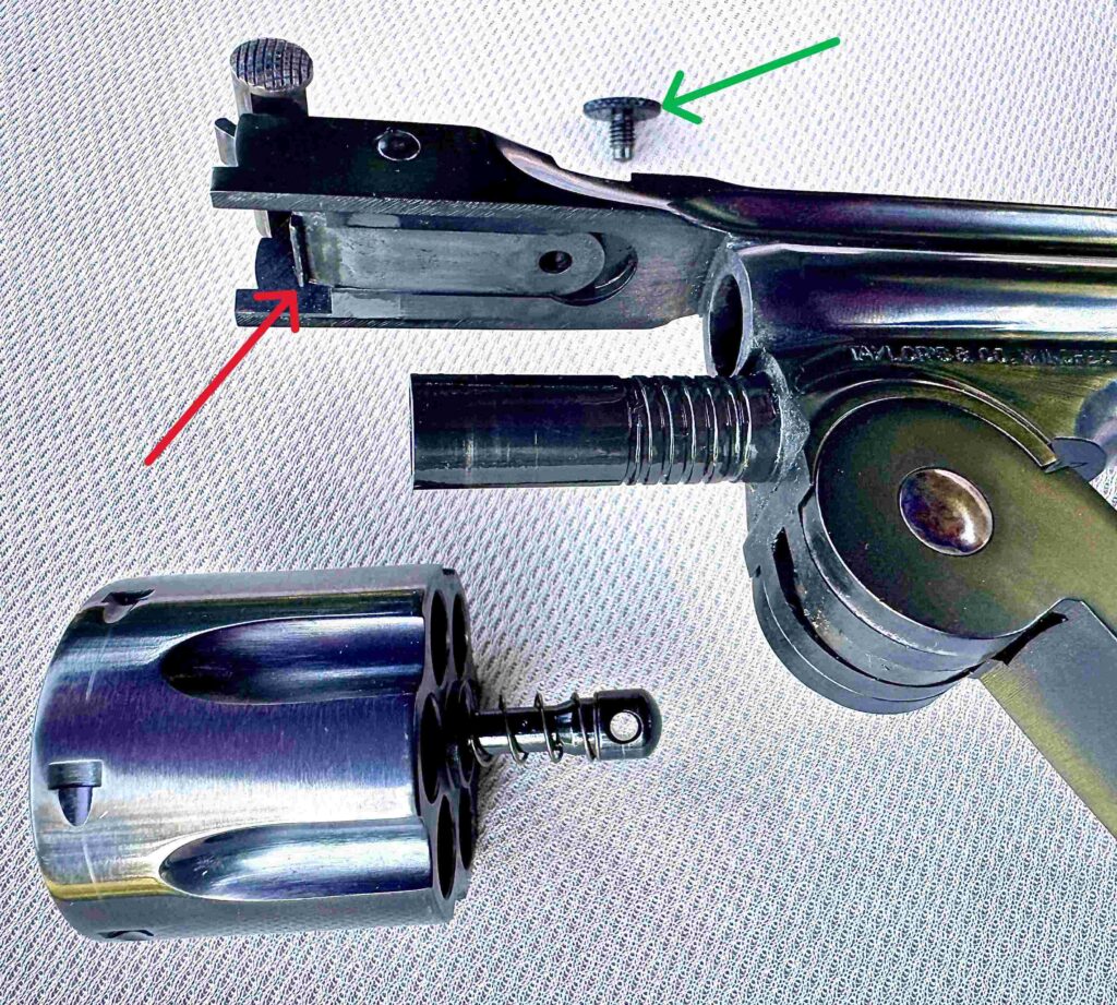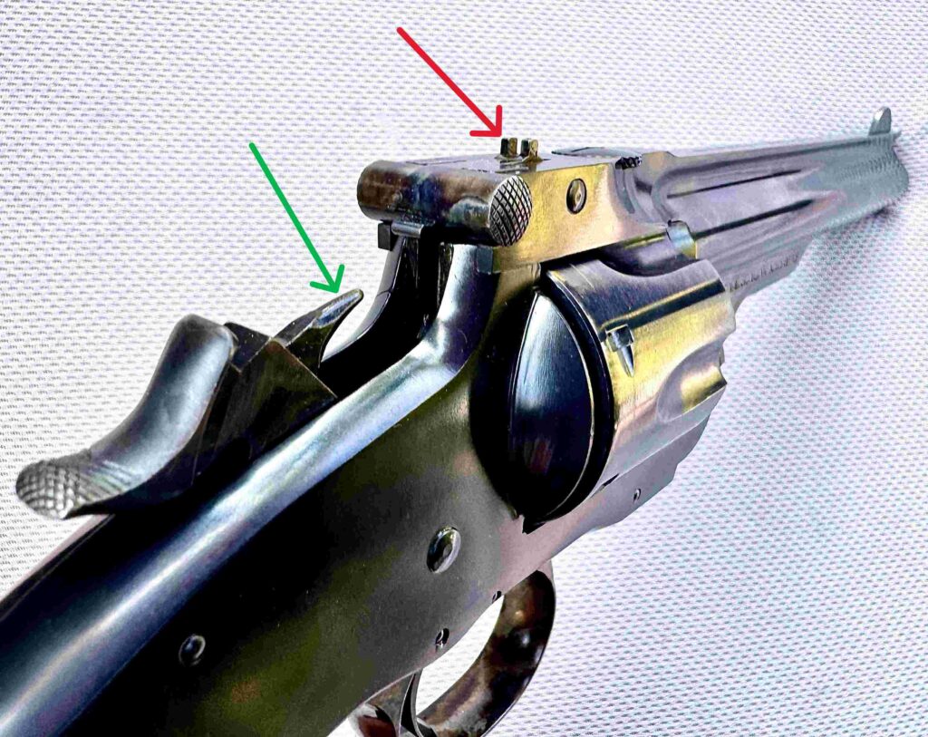 The Model 3 rear sight is integral with the top-latch and looks like two small posts (red arrow); note the firing pin on the nose of the hammer (green arrow).