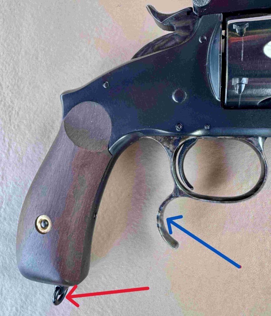 The Russian military specified the unusual spur on the Model 3 trigger guard (blue arrow); on the butt of the grip is a small lanyard ring (red arrow).