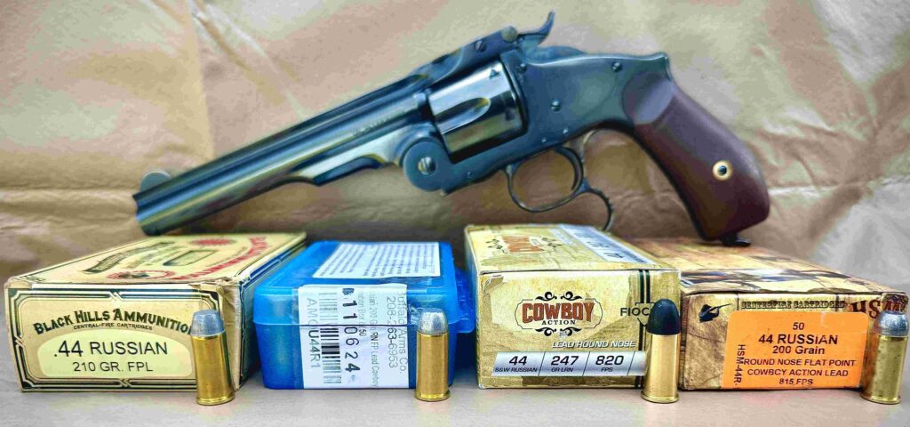 Four brands of factory .44 Russian cartridges were used in the Model 3 T&E; they were from Black Hills, Buffalo Arms, Fiocchi, and HSM.