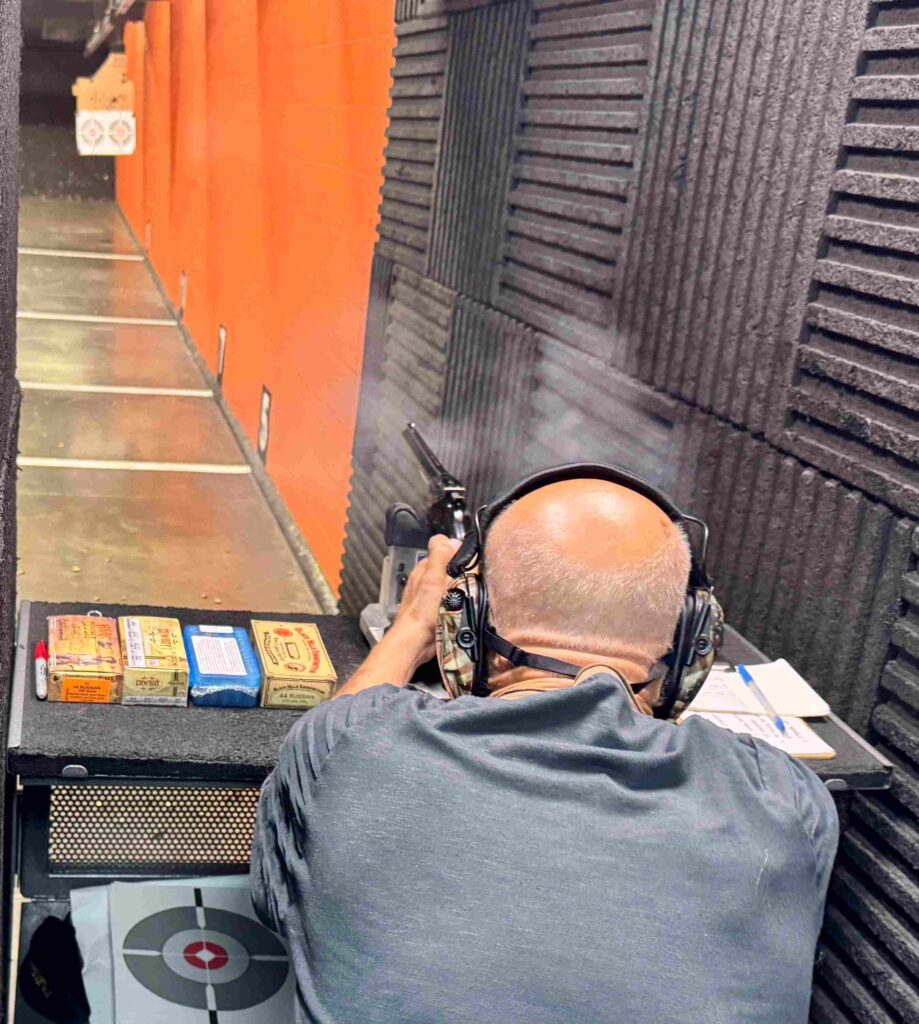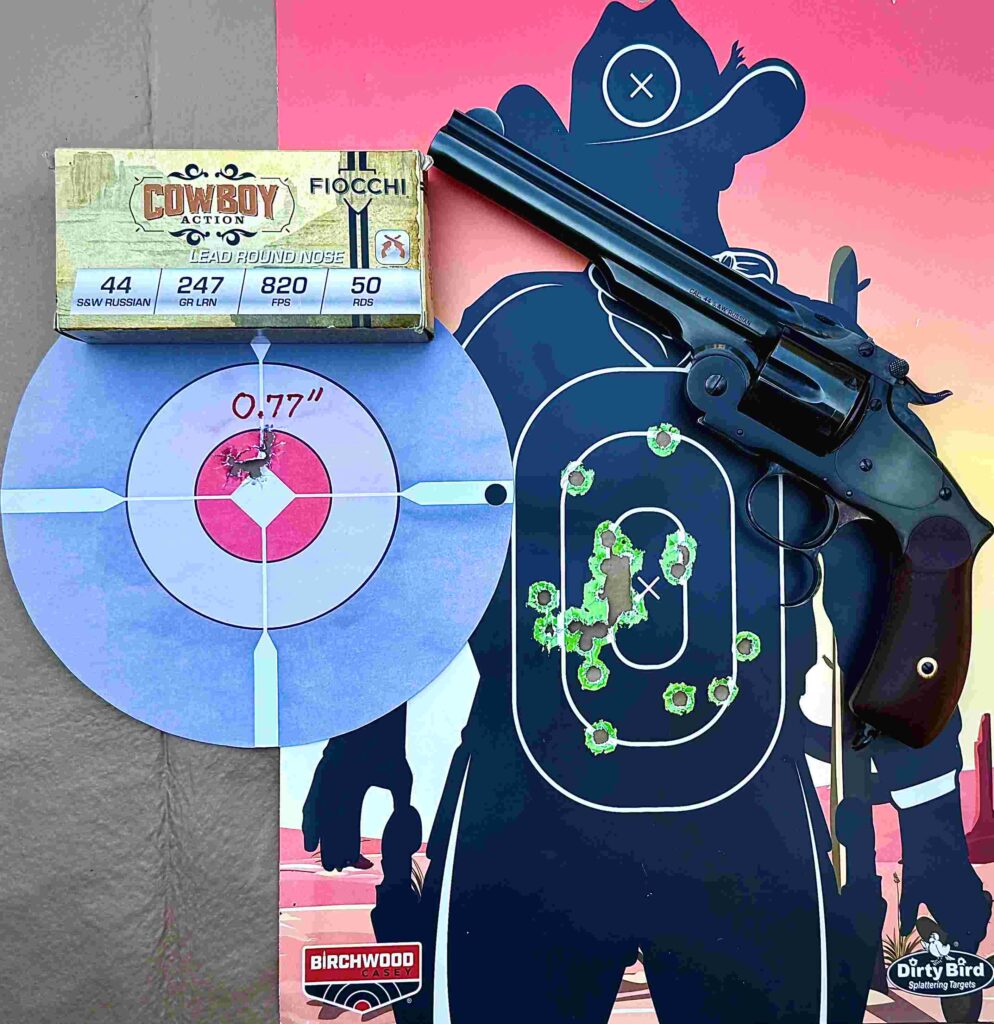 The best 5-shot group was made using the Fiocchi .44 Russian ammo; twenty shots were fired standing, with a two-handed hold, at the “cowboy” target.