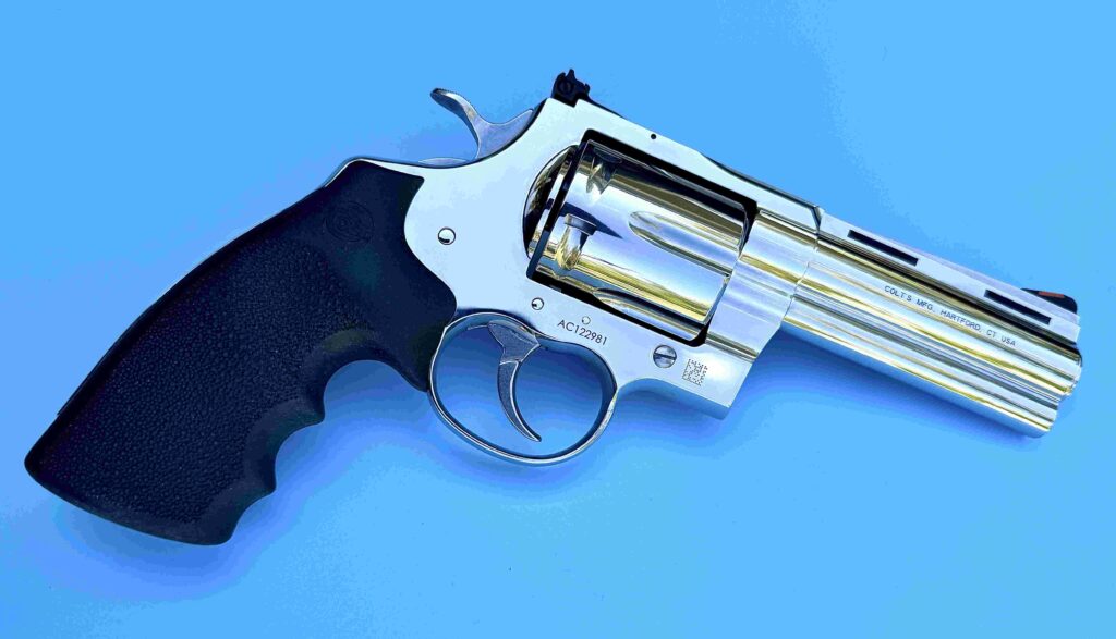 The Anaconda was originally styled after the Colt Python, but was much bigger, and had a barrel with a with a vent-rib and full underlug. Fashioned from stainless-steel, it could be had with a 4, 6 or 8” barrel. Powered by a coil mainspring, the action was more like that of the Mark V series, such as the King Cobra. I received a 6” barrel model in 1993 to test, and I was very impressed with it. Sadly, I sent the test gun back to Colt, and then it was dropped from production in 2003. Now, twenty-two years later, the Anaconda has been resurrected.