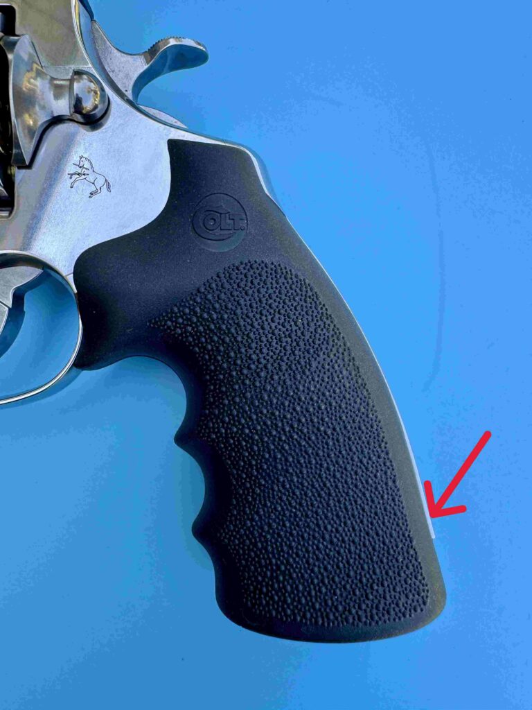 Standard on the Anaconda is Colt-branded Hogue Monogrips; they have pebble-textured sides, finger grooves, and the red arrow points to a fitting issue.