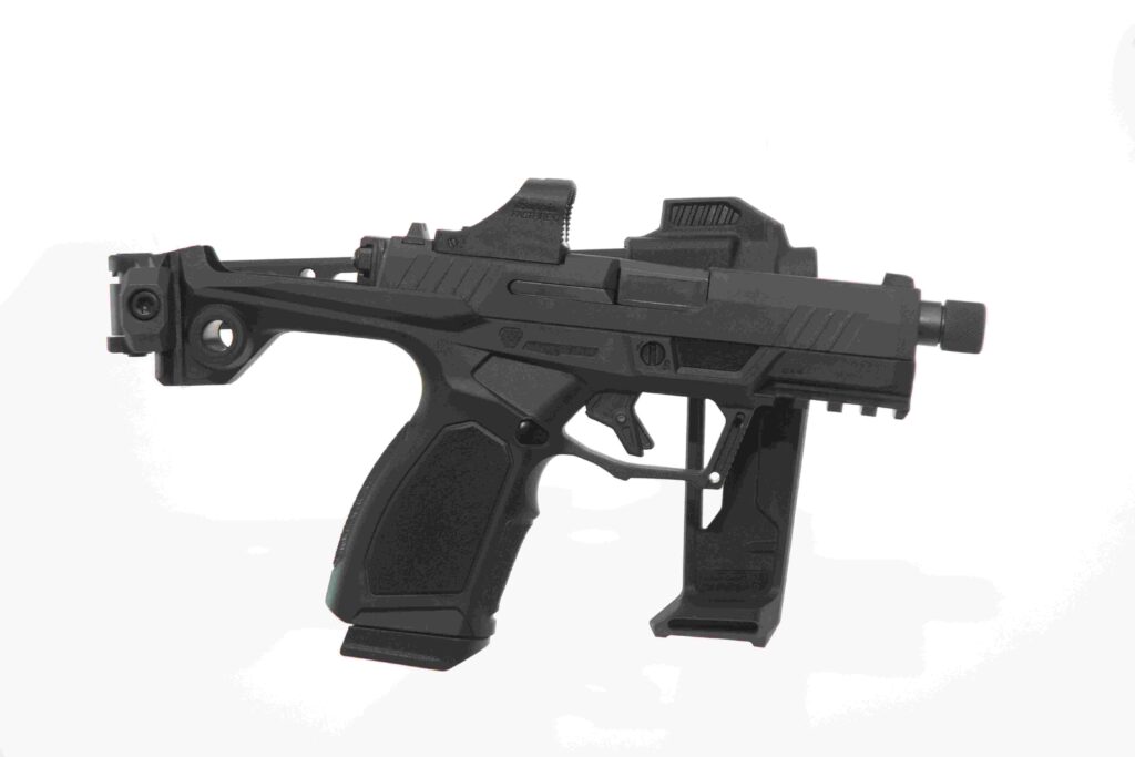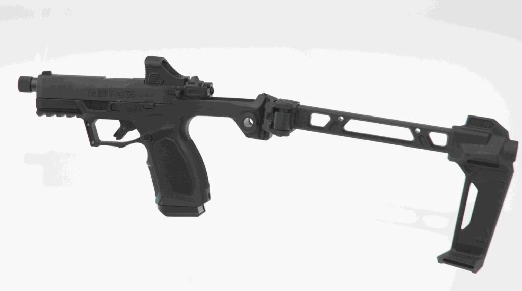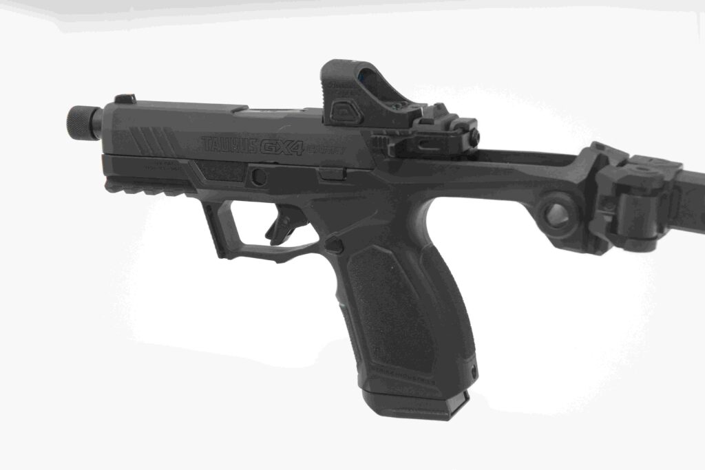 This relatively stable legal landscape undoubtedly convinced Taurus USA to release the new GX4 Strike Bravo. This pistol is a version of the polymer-framed, striker-fired GX4 pistol, except there is a Strike Industries FSA Single Stabilizer attached to the back of the frame of the gun.